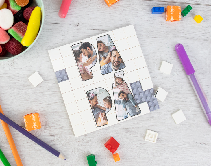 Papá se merece poder rememorar alguno de vuestros mejores momentos todos juntos en familia. ¿Te imaginas contar con un recuerdo de esos instantes que habéis pasado juntos? Este mosaico de bloques personalizado está pensado para sorprender al mejor padre del mundo. ¡64 piezas de bloque que formarán algunas de vuestras imágenes más recordadas! Este juego de piezas de construcción con diseño para padres está hecho para dejar a papá con la boca abierta. Las 64 piezas, compatibles con Lego, vendrán puestas en la placa para bloques de color gris, con el diseño formado a la perfección. Este mosaico tiene unas medidas de 13 x 13 centímetros y podréis armarlo toda la familia y pasar un buen rato todos juntos. Este regalo original para papá cuenta con las letras de la palabra PAPÁ, cada una de ellas decorada con una de esas fotos que tanto os gustan. ¡Podrás elegir las fotos que quieres para el diseño! Solo tendrás que añadir el producto al carrito y subir esas fotos al sistema. Elige en qué letra quieres cada una de las imágenes y crea un diseño hecho exclusivamente para papá. Medidas: 13 x 13 cm. El bloque incluye 64 piezas.