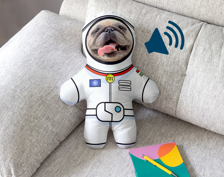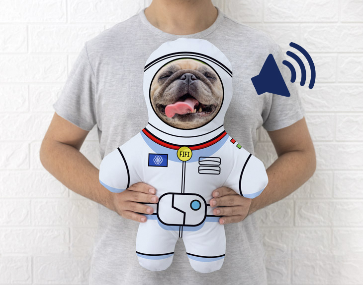 Todavía queda muchísimo por explorar en el espacio. Seguro que hay planetas y territorios todavía desconocidos para el hombre, que no han podido ser descubiertos del todo. Si el hombre no ha podido... ¿Quién dice que no pueda descubrirlo nuestra mascota? Este muñeco de peluche personalizado con foto será el elemento perfecto que tu salón necesita. ¡Podrás abrazar a tu perrete en cualquier momento! Este cojín de astronauta con tu mascota está hecho para sacarle una sonrisa a ese amo que no puede estar sin su perro o gato, sin esa criatura que le alegra los días. Este producto cuenta con una funda impresa a todo color con el diseño del astronauta, y un relleno de lo más blandito. Está hecho de poliéster y cuenta con una altura de 50 centímetros y un largo de 35 centímetros. ¡Podrás cogerlo como agarras a tu mascota! Si siempre has querido que tu perro o gato viaje hasta el mismísimo espacio exterior, este regalo original para niños y adultos es perfecto. Solo tendrás que añadir el producto al carrito, y acceder al área de personalización al que podrás subir esa foto en la que tu mascota sale tan mono. Recorta su cara de la forma más justa posible para que sea aún más realista. En el editor tendrás todas las herramientas necesarias. Escribe su nombre en el collar que encontrarás en el cuello. ¡Le convertirá en el mejor astronauta del mundo! Tras esto, el diseño se imprimirá a todo color en el muñeco. ¡Será perfecto! Además, podrás personalizar este muñeco añadiendo una grabación de voz, eligiendo la opción de “Muñeco con voz”. ¡Podrás incluir la voz o canción que quieras en este muñeco! ¿Cómo se graba el mensaje? ¡Es muy sencillo! Añade el muñeco al carrito y dale al botón de "personalizar". Podrás grabar un mensaje en ese momento (con el micro del móvil o del ordenador) y nosotros nos encargaremos de incluirlo en el peluche. ¡El único límite es tu imaginación! Puedes cantar, ponerte romántico, hacer una proposición... Límite de grabación: 30 segundos. Una vez se reciba el muñeco, habrá que tomar una difícil decisión: se puede repetir el mensaje original (manteniendo pulsado el bracito derecho del muñeco cada vez que quieras escucharlo) o grabar un mensaje nuevo (cada vez que mantengas pulsado el bracito izquierdo del muñeco). Medidas del muñeco: 50x35 cm. Material: poliéster.