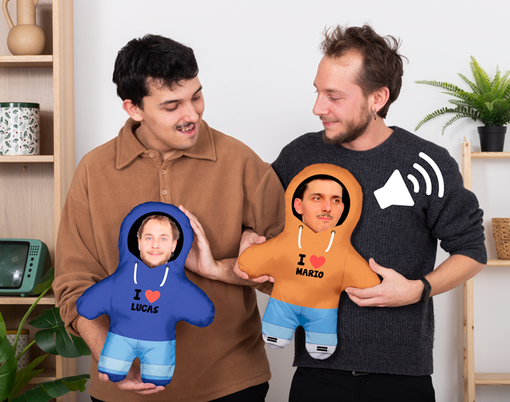Una pareja es mucho más que amor, es diversión y pasión. Si hay en tu vida una pareja de chicos que son los más divertidos, y que además son muy cariñosos, solo se les puede regalar una cosa, una pareja de muñecos personalizada con sus caras y sus nombres. Estos muñecos pueden colocarse en cualquier lugar de la casa y siempre van a hacer cualquier habitación más divertida con su diseño de sudaderas y el nombre de la otra persona. Un regalo ideal para todas esas parejas a las que les gusta ser diferentes y destacar. Elige el color de las sudaderas, el nombre que quieres poner en cada muñeco y la foto más divertida que puedas encontrar, súbela a nuestro diseñador y coloca la cara para que encaje en la plantilla y tendrás un regalo original que nadie se esperará, pero que a todo el mundo le encantará. Además, podrás personalizar este muñeco añadiendo una grabación de voz, eligiendo la opción de “Muñeco con voz”. ¡Podrás incluir la voz o canción que quieras en este muñeco! ¿Cómo se graba el mensaje? ¡Es muy sencillo! Añade el muñeco al carrito y dale al botón de "personalizar". Podrás grabar un mensaje en ese momento (con el micro del móvil o del ordenador) y nosotros nos encargaremos de incluirlo en el peluche. ¡El único límite es tu imaginación! Puedes cantar, ponerte romántico, hacer una proposición... Límite de grabación: 30 segundos. Una vez se reciba el muñeco, habrá que tomar una difícil decisión: se puede repetir el mensaje original (manteniendo pulsado el bracito derecho del muñeco cada vez que quieras escucharlo) o grabar un mensaje nuevo (cada vez que mantengas pulsado el bracito izquierdo del muñeco). Medidas del muñeco: 50x35 cm. Material: poliéster.