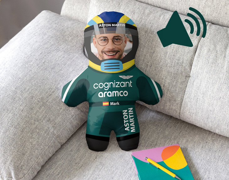 ¿Acaso hay un piloto más mítico dentro de nuestro país que Fernando Alonso? El asturiano nos ha regalado momentos increíbles a todos los españoles. Si siempre has querido ser como uno de los mejores pilotos del mundo, este muñeco de peluche personalizado con foto está hecho para ti. ¡Formarás parte del equipo de Aston Martin! Este cojín de piloto de Formula 1 con cara está pensado para todos los fans de esta disciplina que siempre han querido ser como Fernando Alonso. Un cojín en forma de muñeco que cuenta con unas medidas de 50 centímetros de alto por 35 centímetros de largo. Este muñeco incluye el traje de piloto impreso y está hecho de poliéster. ¡Lo podrás llevar a cualquier parte! Vístete como el mítico piloto y sé el Fernando Alonso de tu propia casa gracias a este regalo original para fans de la Formula 1. ¿Cómo podrás personalizarlo? Añade el muñeco al carrito y entra en el diseñador para personalizar el cojín con la foto de la cara que quieras. Solo tendrás que subir una foto de buena calidad y recortar la cara que quieres de la fotografía. ¡Nosotros nos encargaremos de plasmar este diseño en el cojín! Además, podrás personalizar este muñeco añadiendo una grabación de voz, eligiendo la opción de “Muñeco con voz”. ¡Podrás incluir la voz o canción que quieras en este muñeco! ¿Cómo se graba el mensaje? ¡Es muy sencillo! Añade el muñeco al carrito y dale al botón de "personalizar". Podrás grabar un mensaje en ese momento (con el micro del móvil o del ordenador) y nosotros nos encargaremos de incluirlo en el peluche. ¡El único límite es tu imaginación! Puedes cantar, ponerte romántico, hacer una proposición... Límite de grabación: 30 segundos. Una vez se reciba el muñeco, habrá que tomar una difícil decisión: se puede repetir el mensaje original (manteniendo pulsado el bracito derecho del muñeco cada vez que quieras escucharlo) o grabar un mensaje nuevo (cada vez que mantengas pulsado el bracito izquierdo del muñeco). Medidas del muñeco: 50x35 cm. Material: poliéster.