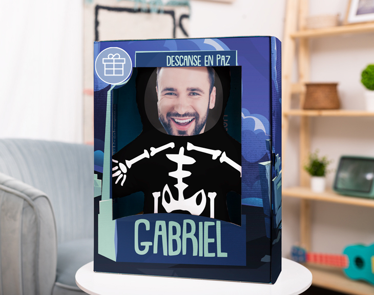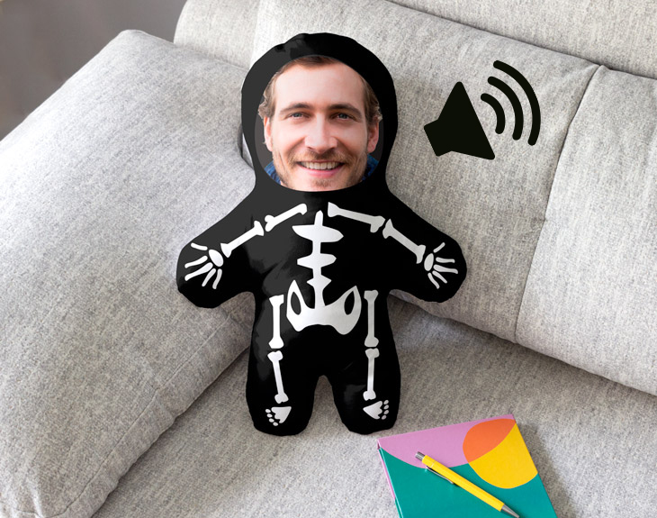¿Acaso puede existir una fiesta mejor que Halloween? Ha llegado el día de pasar mucho miedo y disfrazarse de alguno de los clásicos personajes de esta festividad. Calaveras mexicanas, fantasmas, vampiros... ¿Quién no tiene amigos que siempre se disfrazan de lo mismo todos los años? ¡Ahora ha llegado el momento de sorprenderles a todos con un regalo de lo más terrorífico! Este muñeco de peluche personalizado con foto será la clave para que todos tus amigos disfruten de Halloween. Si tienes un amigo al que le apasiona la noche de las brujas, este cojín de Halloween con foto de cara será un detalle perfecto para asustar a todos los invitados de cualquier fiesta que haya el 31 de octubre. El relleno es súper mullido, lo que vendrá perfecto para abrazar a este muñeco cuando veas una peli de miedo con tus amigos. La funda, hecha de poliéster, vendrá impresa a todo color contando con el esqueleto protagonista y la cara de esa persona a la que quieres sorprender. Sus medidas son de 50 centímetros de alto por 35 de largo. No habrá mejor forma de celebrar un 31 de octubre único que con este regalo original para Halloween. Si te preguntas cómo puedes personalizar este detallito hecho para los amantes del terror... ¡Es más fácil de lo que piensas! Solo tendrás que añadir el producto al carrito, entrar en el portal de personalización y escoger la foto que quieras para este muñeco. ¡Recorta la cara de esa persona especial en nuestro editor! Esta aparecerá en el cuerpo de un tenebroso esqueleto. Sorprender a esa persona tan especial con un peluche personalizado y hecho a medida mola mucho, pero mola aún más añadirle su propia caja personalizada. El mejor regalo del mundo existe y es este adorable muñeco con caja, que dejará sin palabras a quien lo reciba. ¡Parece que ha salido de cualquier juguetería! Pero sin duda lo mejor de todo es que podrás personalizar esta caja con el diseño que más te guste, escribir tu propio texto y añadir todos los detalles necesarios para que quede genial. ¡Deja volar tu imaginación y crea el regalo perfecto! Además, podrás personalizar este muñeco añadiendo una grabación de voz, eligiendo la opción de “Muñeco con voz”. ¡Podrás incluir la voz o canción que quieras en este muñeco! ¿Cómo se graba el mensaje? ¡Es muy sencillo! Añade el muñeco al carrito y dale al botón de "personalizar". Podrás grabar un mensaje en ese momento (con el micro del móvil o del ordenador) y nosotros nos encargaremos de incluirlo en el peluche. ¡El único límite es tu imaginación! Puedes cantar, ponerte romántico, hacer una proposición... Límite de grabación: 30 segundos. Una vez se reciba el muñeco, habrá que tomar una difícil decisión: se puede repetir el mensaje original (manteniendo pulsado el bracito derecho del muñeco cada vez que quieras escucharlo) o grabar un mensaje nuevo (cada vez que mantengas pulsado el bracito izquierdo del muñeco). Medidas del muñeco: 50x35 cm. Material: poliéster.