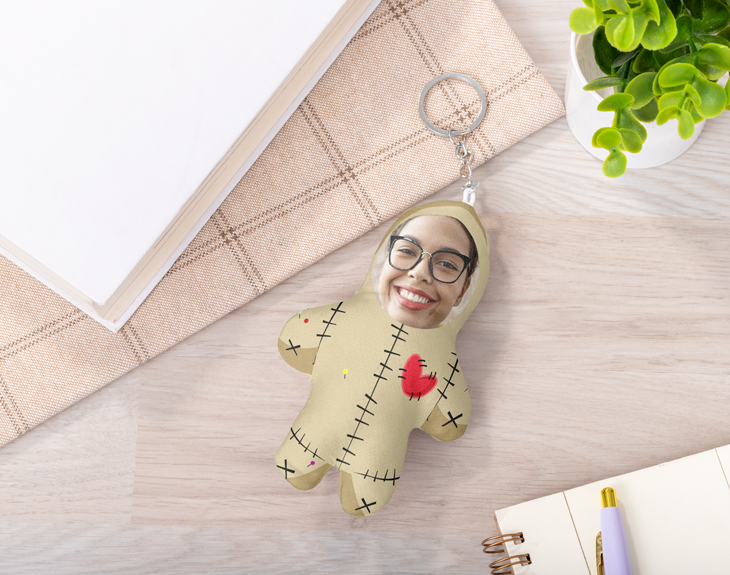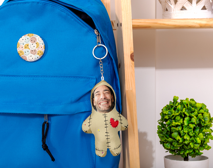 Digamos que si alguien no te cae muy bien, Halloween es el momento perfecto para vengarte un poco. Y que mejor que hacerlo regalándole este aterrador llavero de peluche personalizado con foto y temática vudú. Siempre puede ser un regalo divertido o algo un poco maligno... Si eres de esas personas que cree en el Karma, en las energías y te gusta tener el destino de la gente en tus manos, sin duda este original llavero está hecho para ti. Es ideal para llevarlo siempre contigo, en tus llaves de casa o colgado en una mochila o bolso. ¡Quedará de miedo! Antes de celebrar Halloween, personaliza este llavero con la cara de la persona que tú quieras y hazle el mejor regalo del mundo. Porque a pesar de dar un poco de miedo, es un detalle de lo más divertido. ¡Seguro que todo el mundo le encanta! Medidas del muñeco: 14 x 9 cm. Material: poliéster.