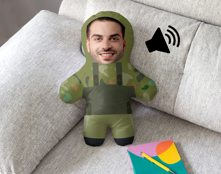 Nuestros militares velan por la seguridad de todo el país ante cualquier amenaza que pueda surgir. ¿Por qué no hacerles un regalo que no pueda olvidar? Este peluche personalizado está hecho para sorprender a ese héroe que lo ha dado absolutamente todo por su país. ¡Lo menos que se merece es un muñeco de poliéster tan original como este! Llegar a ser un grandísimo militar no es para nada un camino de rosas, por lo que este muñeco de militar personalizado con su foto podrá ser el mayor reconocimiento que le puedan hacer sus seres queridos. ¡Podréis incluir una foto de su cara en el diseño! Este peluche quedará de lujo en cualquier lugar de vuestro hogar, gracias a su medida de 50 centímetros de alto por 35 de largo. ¡Y quedará perfecto con este diseño de traje de militar tan chulo! Si quieres sorprender a esa persona que ha querido ser militar desde chiquitito, este regalo original para militares es perfecto para él o ella. Podrás subir la imagen que quieras a través del área de personalización, una vez hayas añadido el producto al carrito. Clica sobre el círculo de foto para subir la foto y recórtala para dejar la cara que quieras en el diseño. Además, podrás personalizar este muñeco añadiendo una grabación de voz, eligiendo la opción de “Muñeco con voz”. ¡Podrás incluir la voz o canción que quieras en este muñeco! ¿Cómo se graba el mensaje? ¡Es muy sencillo! Añade el muñeco al carrito y dale al botón de "personalizar". Podrás grabar un mensaje en ese momento (con el micro del móvil o del ordenador) y nosotros nos encargaremos de incluirlo en el peluche. ¡El único límite es tu imaginación! Puedes cantar, ponerte romántico, hacer una proposición... Límite de grabación: 30 segundos. Una vez se reciba el muñeco, habrá que tomar una difícil decisión: se puede repetir el mensaje original (manteniendo pulsado el bracito derecho del muñeco cada vez que quieras escucharlo) o grabar un mensaje nuevo (cada vez que mantengas pulsado el bracito izquierdo del muñeco). Medidas del muñeco: 50x35 cm. Material: poliéster.