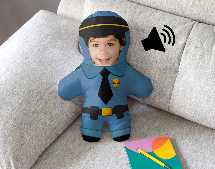 No es nada fácil conseguir ser policía. Hay que contar con muchísimas cualidades para ello: valentía, sacrificio, coraje, pasión por ayudar a la gente... ¿Conoces a alguien que reúne todas esas características? Este peluche personalizado está pensado para todas esas personas que sueñan con ser los polis más chulos de la comisaria. ¡Ha llegado el momento de cazar a los malos con este muñeco tan chulo! ¿Qué niño no ha soñado con ser el mejor poli del mundo? Este muñeco de policía personalizado con su foto será el detalle perfecto para hacer que comience a encarcelar criminales desde pequeño. Este muñeco es perfecto para abrazarlo en cualquier momento. Está hecho de poliéster, es súper mullido y tiene una medida de 50 centímetros de alto por 35 de largo. ¡No habrá un detalle que pueda quedar mejor en su cuarto! Un regalo original como este puede ser la mejor sorpresa para esa personita que sueña con convertirse en policía en algún momento. ¿Qué mejor forma de hacer que su sueño esté un poco más cerca que con un muñeco con su cara? Añade el producto al carrito y entra en el área de personalización para subir la foto que quieras al diseño. Una vez subida la imagen solo tendrás que recortar la foto en el editor y ajustarla a la plantilla del muñeco. ¡Será sorpresa de lo más inesperada! Además, podrás personalizar este muñeco añadiendo una grabación de voz, eligiendo la opción de “Muñeco con voz”. ¡Podrás incluir la voz o canción que quieras en este muñeco! ¿Cómo se graba el mensaje? ¡Es muy sencillo! Añade el muñeco al carrito y dale al botón de "personalizar". Podrás grabar un mensaje en ese momento (con el micro del móvil o del ordenador) y nosotros nos encargaremos de incluirlo en el peluche. ¡El único límite es tu imaginación! Puedes cantar, ponerte romántico, hacer una proposición... Límite de grabación: 30 segundos. Una vez se reciba el muñeco, habrá que tomar una difícil decisión: se puede repetir el mensaje original (manteniendo pulsado el bracito derecho del muñeco cada vez que quieras escucharlo) o grabar un mensaje nuevo (cada vez que mantengas pulsado el bracito izquierdo del muñeco). Medidas del muñeco: 50x35 cm. Material: poliéster.