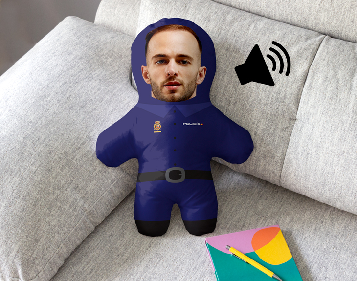 El camino para llegar a ser Policía Nacional es difícil, pero con mucho esfuerzo y ganas... ¡Todos los sueños se pueden cumplir! Este peluche personalizado está hecho para esa persona que ha trabajado muy duro para llegar a su trabajo soñado: ser el mejor policía de toda la ciudad. ¡Un peluche que le sacará una sonrisa todos los días! Tras tantas pruebas y exámenes para convertirse en Policía Nacional... ¿Qué mejor forma de recompensar a esa persona especial que con un muñeco de policía personalizado con su foto como este? Este está hecho de poliéster y cuenta con la forma perfecta para ponerle la cara que quieras en el diseño. Su altura es de 50 centímetros y su longitud es de 35 centímetros. ¡Lo podrá poner en cualquier rincón de la casa! Este puede ser el mejor regalo original para policías... ¡Será un detalle que no se esperará nunca! ¿Cómo podrás personalizar este regalo tan curioso? Solo tendrás que añadir el producto al carrito y entrar en el área de personalización, donde encontrarás la plantilla del muñeco. Clica sobre el círculo perteneciente a la cara y sube la imagen que quieras incluir ahí. Después solo tendrás que recortarla y ajustarla al diseño. ¡Será una sorpresa de lo más especial! Además, podrás personalizar este muñeco añadiendo una grabación de voz, eligiendo la opción de “Muñeco con voz”. ¡Podrás incluir la voz o canción que quieras en este muñeco! ¿Cómo se graba el mensaje? ¡Es muy sencillo! Añade el muñeco al carrito y dale al botón de "personalizar". Podrás grabar un mensaje en ese momento (con el micro del móvil o del ordenador) y nosotros nos encargaremos de incluirlo en el peluche. ¡El único límite es tu imaginación! Puedes cantar, ponerte romántico, hacer una proposición... Límite de grabación: 30 segundos. Una vez se reciba el muñeco, habrá que tomar una difícil decisión: se puede repetir el mensaje original (manteniendo pulsado el bracito derecho del muñeco cada vez que quieras escucharlo) o grabar un mensaje nuevo (cada vez que mantengas pulsado el bracito izquierdo del muñeco). Medidas del muñeco: 50x35 cm. Material: poliéster.