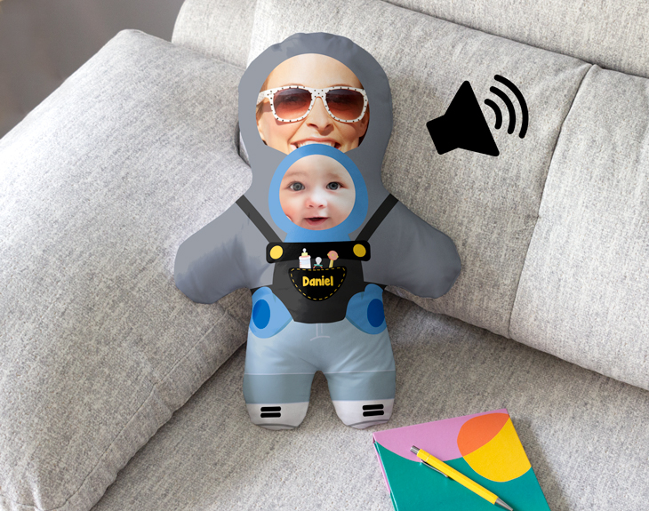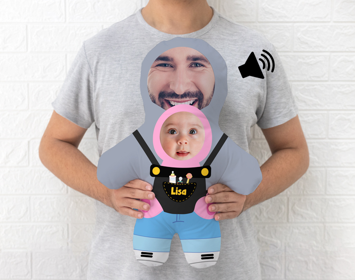 ¿Quieres sorprender a ese padre o madre que siempre está pendiente de cómo se encuentra su pequeño/a? ¡Sácale una sonrisa de la forma más divertida posible gracias a este muñeco de peluche personalizado! Una figura que representará a la perfección cómo es su día a día: teniéndolo siempre en brazos y cuidándole lo máximo posible. Si tu pareja está llevando a vuestro hijo en brazos de un lado para otro de la casa, este muñeco de peluche con diseño de portabebés será la mejor manera de hacerle reír. Se verá reflejado al 100% en este producto, hecho de poliéster y con una altura de 50 centímetros de alto y una longitud de 35 centímetros. ¡Será un peluche de lo más achuchable! No habrá una mejor forma de dejar a esa persona especial con la boca abierta que con un regalo original para padres como este. Podrás añadir las fotos que quieras en la parte que representa la cara del muñeco, personalizándolo en el área de diseño. Añade el producto al carrito y sube la foto dentro del sistema. ¡Solo tendrás que recortar la cara y ajustarla al muñeco! Además, podrás personalizar este muñeco añadiendo una grabación de voz, eligiendo la opción de “Muñeco con voz”. ¡Podrás incluir la voz o canción que quieras en este muñeco! ¿Cómo se graba el mensaje? ¡Es muy sencillo! Añade el muñeco al carrito y dale al botón de "personalizar". Podrás grabar un mensaje en ese momento (con el micro del móvil o del ordenador) y nosotros nos encargaremos de incluirlo en el peluche. ¡El único límite es tu imaginación! Puedes cantar, ponerte romántico, hacer una proposición... Límite de grabación: 30 segundos. Una vez se reciba el muñeco, habrá que tomar una difícil decisión: se puede repetir el mensaje original (manteniendo pulsado el bracito derecho del muñeco cada vez que quieras escucharlo) o grabar un mensaje nuevo (cada vez que mantengas pulsado el bracito izquierdo del muñeco). Medidas del muñeco: 50x35 cm. Material: poliéster.