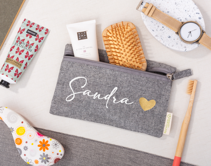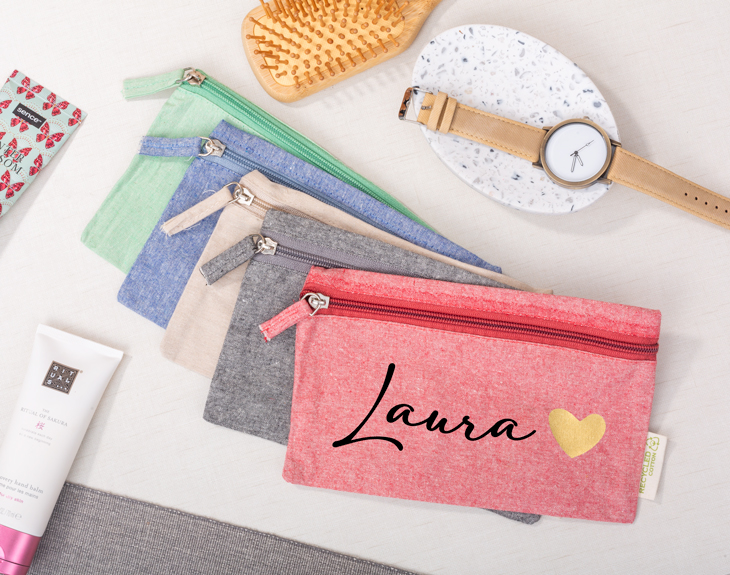 ¿Conoces a alguien que siempre lleva bolsos enormes y le cuesta muchísimo encontrar cosas dentro? ¡Tenemos la solución! Nuestro neceser de algodón reciclado es perfecto para darle una sorpresa en su cumpleaños, en vuestro aniversario o en cualquier otra fecha especial. Podrá guardar sus objetos más personales como las llaves, la cartera o el móvil, así no tendrá que tirarse horas buscándolos. También es una gran idea para viajes, y es que podrá llenarlo de su maquillaje favorito, ¡incluso le entrará el cepillo de pelo o la colonia! Solamente necesitamos que escojas el color de neceser que más te guste y nos digas su nombre. El diseño incluye un corazón en dorado que le da un toque chic y muy elegante. ¡Un regalo original perfecto para todo tipo de ocasiones! Material: algodón reciclado. Medidas: 21x12,5 cm.