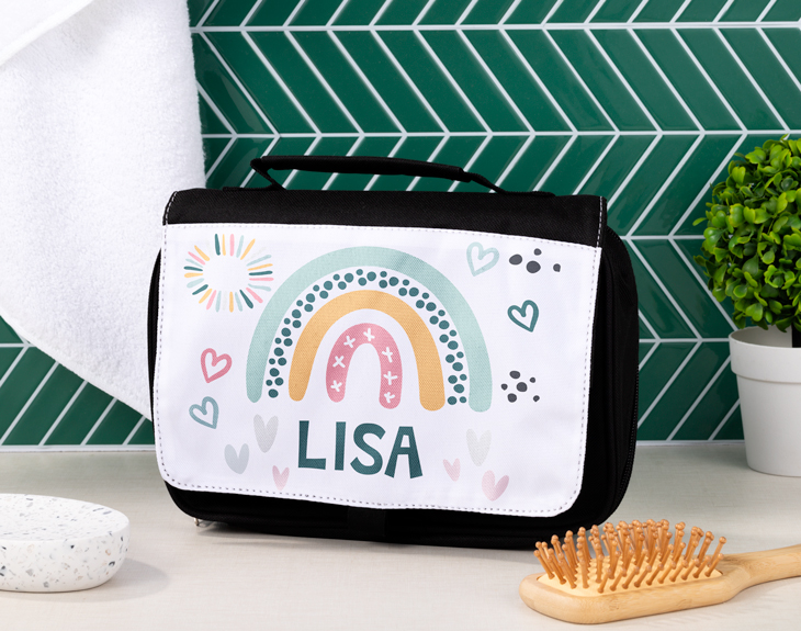 ¿Quién no ha querido saber qué hay al otro lado del arcoíris? Las excursiones y los viajes sirven para descubrir lugares inexplorados, ciudades que nunca pensabas que ibais a conocer. Los más pequeños de la casa también tienen derecho a viajar, pero tienen que estar lo más aseados posibles. ¡Este neceser personalizado se ocupará de guardar todo lo que necesita! Y es que un neceser para colgar con diseño de arcoíris como este le vendrá de lujo a todos esos nenes siempre lo pierden todo. Al contar con un asa y con unas medidas de 20 centímetros de alto por 24 de ancho, podrá llevar este regalazo a todas partes. ¡Tu pequeño podrá tener el mejor neceser posible! ¿Al más peque de la casa le encantan los arcoíris y esas tardes después de una fuerte tormenta? ¡Podrá llevar todos estos colores pastel gracias a este regalo original para viajes! El diseño lo encontrarás en el área de personalización, una vez hayas añadido el producto al carrito. Solo tendrás que escribir el nombre de tu hijo/a en el cuadro de texto. ¡Un regalo que nunca podría esperarse! Medidas: 20 cm. de alto x 24 cm. de ancho.