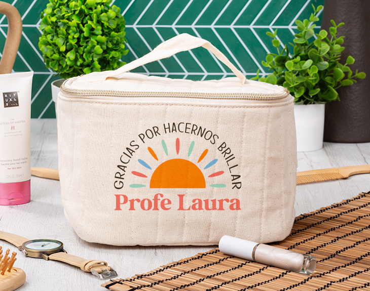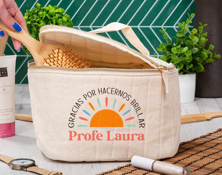Ya llega el fin de curso, por fin, se acercan las esperadas vacaciones. Ahora toca despedirse de los compis de clase y de los profes. ¿Este año habéis tenido mucha suerte con vuestro maestro? Si es de esos que se preocupan por que sus alumnos aprendan y al mismo tiempo se diviertan, está claro que se merece un regalo de despedida. Para eso, nuestro neceser beige personalizado con diseño "Nos haces brillar" es el detalle perfecto para sorprender a esos profes que sacan lo mejor de sus alumnos. Este neceser es perfecto para guardar todas esas cosas de higiene personal, como el cepillo de dientes, el peine, las cremas, lentillas... ¡Cabe de todo! Lo más especial de este neceser es que es personalizable, podrás escribir el nombre del mejor profe del mundo. ¡Será súper especial! Así nunca se olvidará de su clase favorita. Por último, para personalizar este neceser es muy sencillo. El primer paso a seguir consiste en añadir el producto al carrito y entrar al área de personalización. Pronto estará perfecto y listo para regalar. Dimensiones: 23 x 14cm