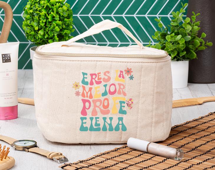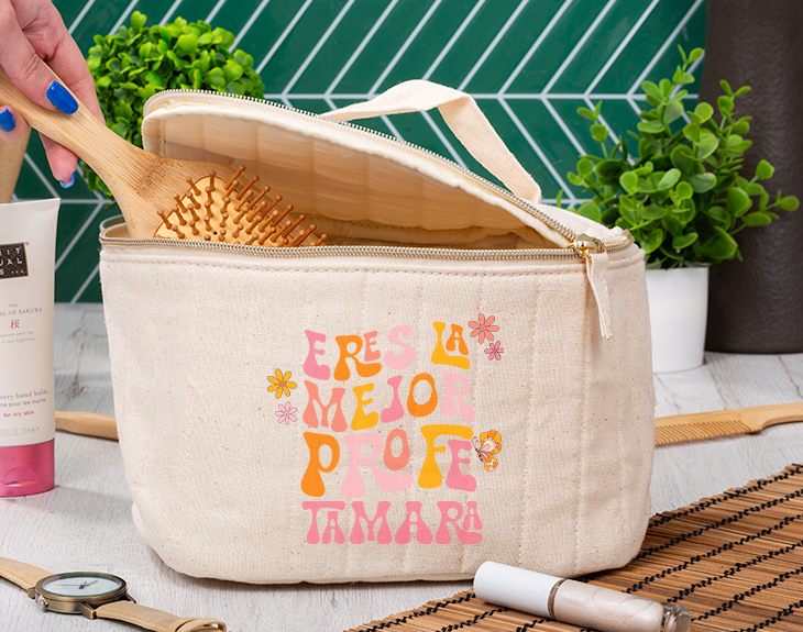 Ha llegado el momento en el que toca decir adiós a las clases, a nuestros compis y también a los profesores que nos han acompañado durante este año. Seguro que habéis tenido la suerte de tener a la mejor profe del mundo y por eso se merece un detalle único para que siempre se acuerde de vosotros. Este neceser personalizado es perfecto para este tipo de ocasiones y es ideal para dejar sin palabras a esa profe tan guay. ¡Es lo más! Si vuestra profe quiere aprovechar al máximo el verano y no va a parar de viajar, este original regalo será su mejor aliado para estos meses de vacaciones. Gracias a su forma y tamaño, podrá guardar todo lo que necesite y llevarlo donde quiera y además siempre se acordará de que es la mejor profe del mundo. Para personalizar este neceser beige, lo único que tienes que hacer es añadir el producto al carrito y entrar en el área de personalización. Podrás elegir el diseño con los colores que más te gusten y después escribir el nombre de tu profe para que quede perfecto y listo para regalar. ¡Será el mejor regalo del mundo! Dimensiones: 23 x 14 cm.