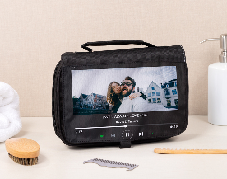 No podríamos vivir sin música. Sin escuchar nuestras canciones favoritas todos los días, sin bailar esos temazos que están hechos para darlo todo o sin poner una playlist de Spotify para relajarnos en cualquier momento del día. Y es que esta aplicación se ha vuelto indispensable para todos los amantes de la música. Poder escuchar las canciones que más nos gustan en todo momento, ¡no tiene precio! Y no hay mejor sensación que viajar y poner tu lista de canciones creada para ese momento tan especial. Por eso, para los verdaderos amantes de la música y viajar, el regalo perfecto es este neceser personalizado al estilo Spotify. Este neceser es perfecto para regalárselo a esa persona con la que compartes afición por la música o tenéis una canción favorita y quieres que siempre se acuerde de ti. Con su capacidad no se olvidará de nada porque cabe de todo. Este original regalo es el aliado perfecto de cualquier viaje, es muy práctico. Además, cuenta con un gancho para que puedas colgarlo y quede abierto y así tendrás siempre a mano todas tus cosas. También cuenta con varios compartimentos para que puedas separar todo muy bien. Y la mejor parte es que podrás personalizar tu neceser y que parezca una canción salida de Spotify. En este diseño podrás añadir una imagen y el texto que quieras para acompañarla y que quede único y personal. ¡Y ya estará listo para conocer mundo! Dimensiones: 20 cm de alto x 24 cm de ancho.