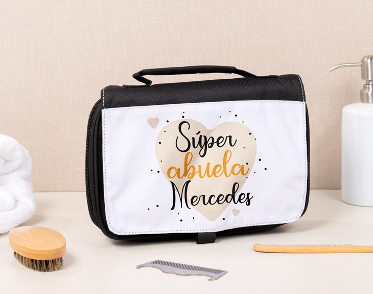 Las abuelas son lo mejor del mundo. No hay nada como disfrutar de las abuelas cuando somos pequeños y que sigan en nuestra vida cuando somos mayores. Además, los nietos son lo mejor que tienen las abuelas. Cuando somos niños, nos encanta pasar tiempo con nuestras abuelas, ir al parque con ellas, que nos hagan nuestro plato de comida favorito, que nos acompañen al colegio... Seguro que tienes muchos recuerdos con ella. Y para que nunca se olvide de que para ti es la mejor abuela del mundo y que la quieres muchísimo, tenemos el regalo ideal para ella. Este neceser personalizado es perfecto para guardar todas sus cosas y tenerlas siempre organizadas. Este neceser es perfecto para viajar o para organizar nuestras cosas en casa y seguro que a cualquier abuela le encanta. Es muy práctico, se puede meter en cualquier lado y cabe de todo. Además, este original regalo cuenta con un gancho para que pueda colgarlo donde quieras y que quede abierto, así siempre tendrá a mano todo lo que quiera. También cuenta con varios compartimentos para poder separar todos los productos y utensilios y mantenerlo siempre ordenador y a la vista. Y para conseguir que este regalo sea único y muy personal, tendrás que personalizar tu neceser añadiendo el nombre de esa super abuela a la que le quieres decir lo mucho que le quieres. Será un detalle único y perfecto para poder usarlo cuando quiera. ¡Es el regalo perfecto! Dimensiones: 20 cm de alto x 24 cm de ancho.
