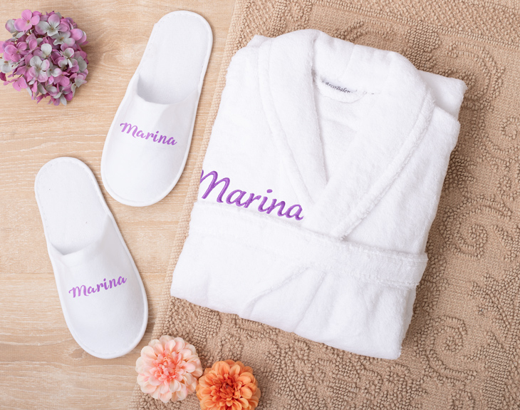 • Albornoz con nombre bordado. • Zapatillas de estar por casa • Tarjeta Recordatoria.