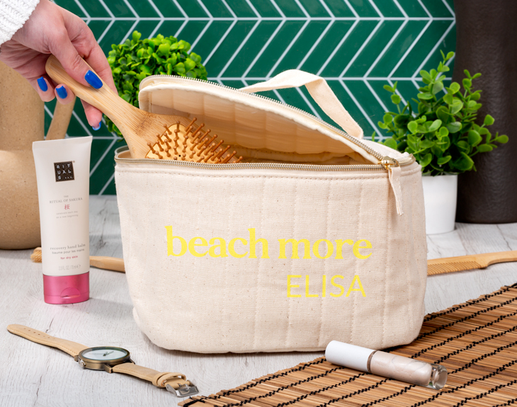 • Bolso Capri personalizado. • Neceser beige personalizado. • Tarjeta recordatoria.