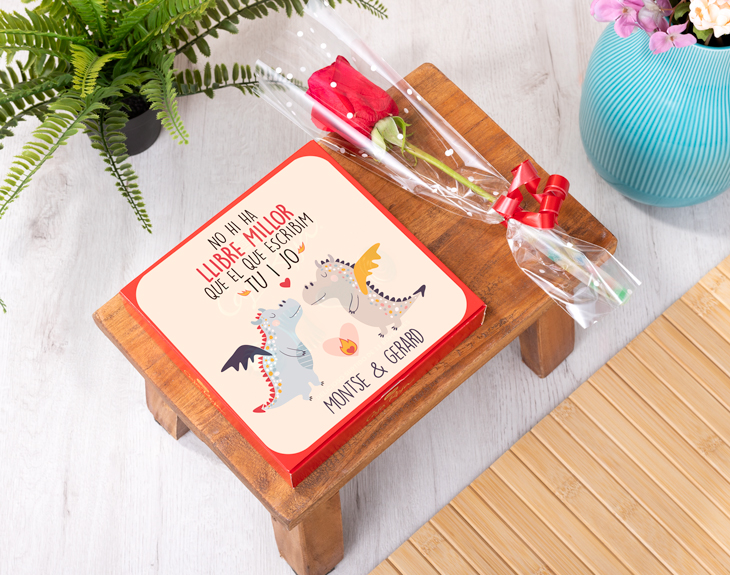 ¿El día de Sant Jordi es vuestro favorito? Si estás deseando que llegue el 23 de abril para regalar una rosa y un libro, pero este año quieres hacerlo aún más especial, este pack personalizado es perfecto. Y es que, conseguirás endulzar el día de esa persona tan importante incluyendo una caja de chocolates personalizada. Hay miles de novelas románticas, pero seguro que ninguna tan bonita como la vuestra, por eso, este diseño tiene vuestro nombre. Emocionante, divertido, inspirador y lleno de amor, sin duda, habéis escrito el mejor cuento de todos. No se nos ocurre una manera más especial de demostrar al protagonista o la protagonista de tu historia lo importante que es para ti, que hacerlo en el día de Sant Jordi de una forma tan original.¡Le encantará! Importante: Este diseño está disponible en catalán y en castellano, en el apartado "Ver más diseños" de nuestro diseñador, podrás escoger la opción que más te guste.