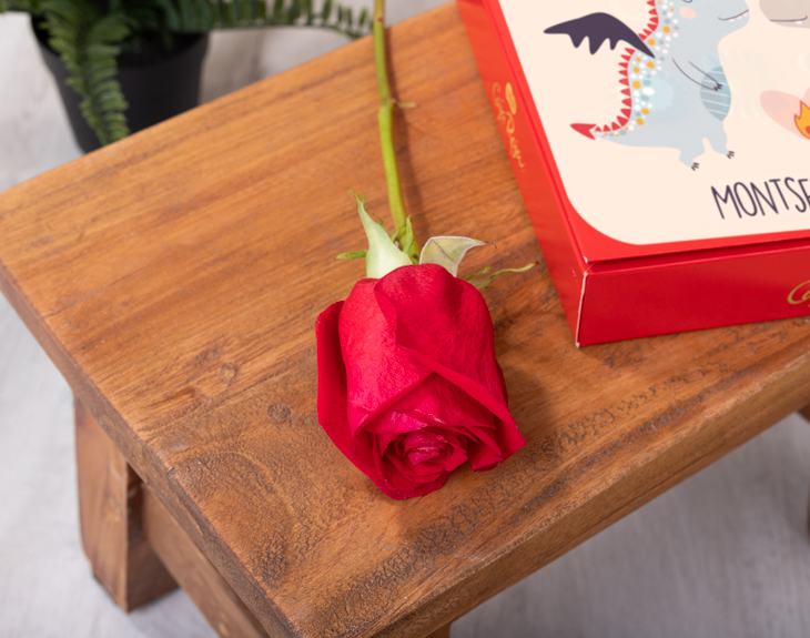 • Rosa. • Bombones Nestle Caja Roja 100g personalizados. • Tarjeta Recordatoria.