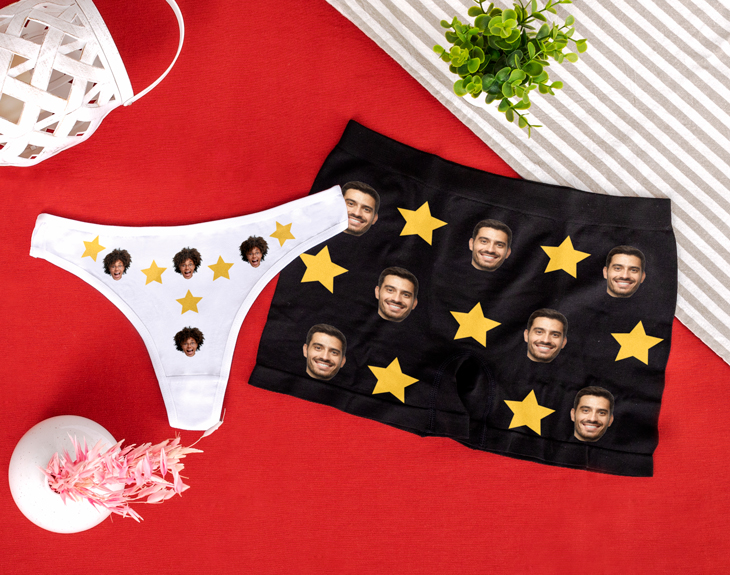 Ha llegado el momento de hacerle el mejor regalo del mundo a tu pareja: ¡nuestro pack de calzoncillo y tanga personalizado! Un detalle diferente para que paséis la mejor velada romántica de vuestra vida con esta ropa interior tan diferente y divertida. Si os encanta ir a conjunto de vez en cuando, este pack está hecho para vosotros, porque podéis personalizarlo con este diseño lleno de estrellitas. ¡Os encantará! Vuestro aniversario, San Valentín, su cumple o cualquier otra fecha especial, son los mejores momentos para regalar este original set personalizado con el que triunfarás con tu novio o novia. Olvídate de los típicos regalos aburridos y sorprende a esa persona que tanto quieres con este detallito tan atrevido y especial para las parejas más juguetonas. Lo mejor es que son tan cómodos que se convertirán en vuestras prendas favoritas. ¡Son geniales! Este pack incluye unos calzoncillos negros y un tanga blanco que podéis personalizar a vuestro gusto con este precioso diseño. Personalizar este pack de ropa interior es muy sencillo. Añade el producto al carrito y entra en el área de personalización. Ahí, podrás personalizar cada prenda por separado para añadir la cara que queráis en cada uno junto a este diseño tan guay de estrellitas. Quedará genial y lo mejor es que... ¡Triunfarás con tu pareja! Especificaciones tanga: Medidas: 30 x 21,5 cm. Talla: S, única. Material: algodón natural. Color: blanco Especificaciones calzoncillo: - Talla M: 33,5 x 25 centímetros. - Talla L: 36 x 26 centímetros. - Talla XL: 47 x 31 centímetros. Material: poliamida (90%) y elastano (10%). Importante: se puede lavar a una temperatura máxima de 30 grados. No es recomendado usar lejía ni secarlo en la secadora. No se debe planchar.