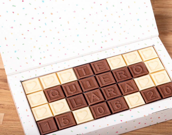 Hay regalos con los que son imposible no acertar, y sin duda alguna, los choco mensajes y las tazas personalizadas son algunos de ellos. Divertidos, prácticos, emotivos y muy muy originales. ¡Lo tienen todo! Por eso, hemos querido hacer este pack personalizado para que dejes sin palabras a esa persona tan especial en cualquier ocasión. Solamente tienes que decirnos el mensaje que quieres escribir con letras de chocolate y la foto que quieres añadir en la taza. ¡Una bonita manera de endulzarle el día! Tenemos disponibles dos tipos de chocomensajes, uno de 24 caracteres y otro de 32. Medidas: - Tamaño de cada letra de chocolate: 2,3cm x 2,3cm - Tamaño de la caja confetti: 23cm x 11cm x 2,5cm - Capacidad de la taza: 33 cl