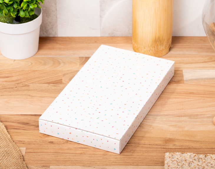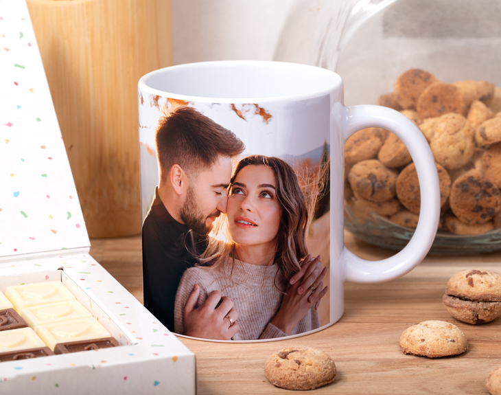 • Taza de cerámica con tu foto y/o diseño en cajita individual. (33 cl) • Letras de chocolate con leche (32 o 24 letras). • Caja. • Tarjeta recordatoria.