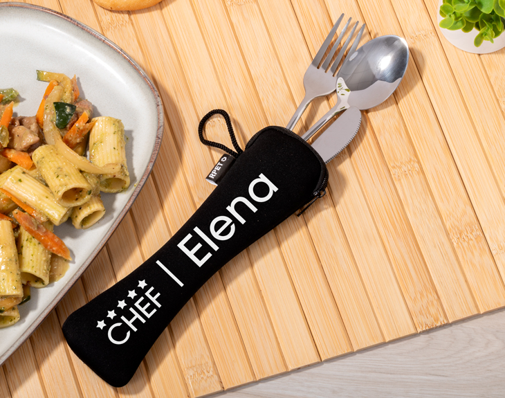 • Cubiertos grabados con nombre. (Incluye un cuchillo, un tenedor y una cuchara ) • Funda negra personalizada "Chef 5 estrellas". • Tarjeta Recordatoria.