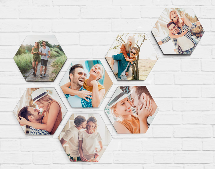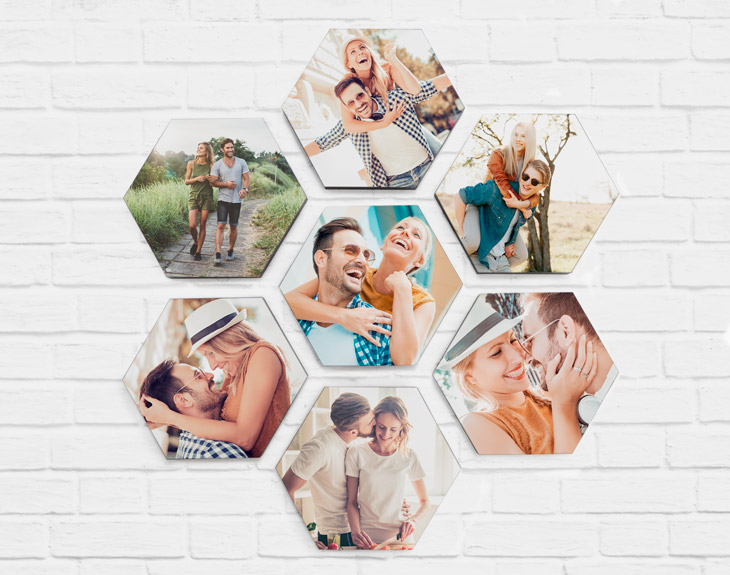 • Fotos hexagonales de madera compacta con el interior negro (24,5x21 cm). • Tarjeta Recordatoria.