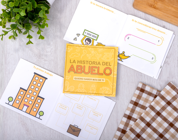 ¿Quieres saber todo acerca de tu abuelo? Si no hay nada que te guste más que estar con ék y que te cuente todas sus hostorias de juventud, este pack personalizado es perfecto para sentaros a tomar un café y que revele todos los detalles de su vida. Y es que, seguro que no sabes cómo era su profesor favorito, en qué se gastó su primer sueldo o cuál era su juguete favorito cuando era pequeño. Con este libro tan especial podrá rellenar toda su historia y que así quede guardada para siempre. Además, seguro que al responder a estas preguntas, se acuerda de un montón de anécdotas que nunca antes te había contado. ¿A que estás deseando escucharlas?¡Un detalle perfecto para pasar un rato fantástico con tu abuelo! Y es que, si hay personas que se merecen todo y más, esos son los abuelos, por eso, este pack personalizado es una manera genial de demostrarle lo mucho que le quieres y lo feliz que eres de tener un abuelo tan guay como él. ¡Se emocionará muchísimo! Por cierto, no te olvides de personalizar la taza. Solamente tienes que decirnos su nombre y nosotros nos encargaremos de insertarlo en el diseño par que quede perfecto.