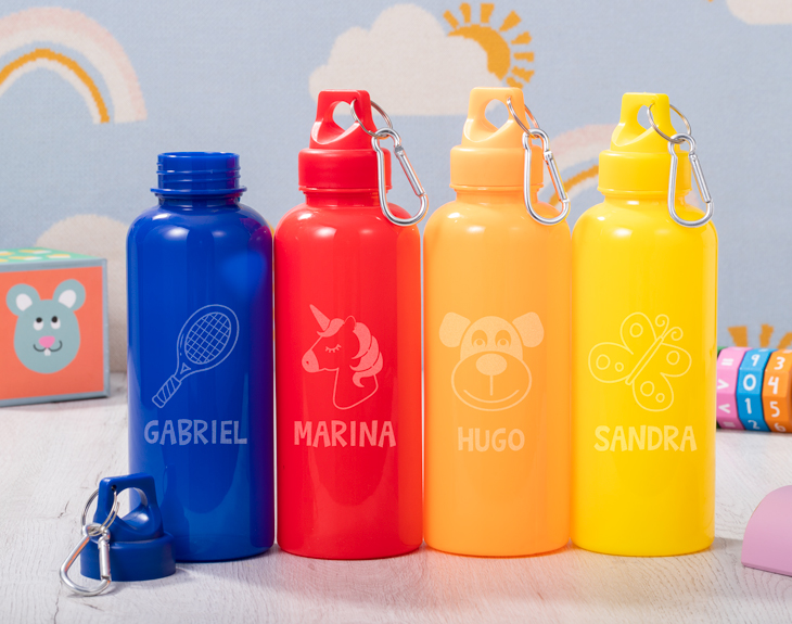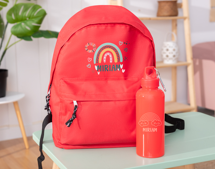 Hay que prepararse cómodamente para los intensos días de clase, gimnasio o excursión. ¡Pero sin renunciar al estilismo y los bonitos diseños! Da igual lo que necesites. Todo podrás llevarlo sin ninguna molestia con este pack de mochila y cantimplora personalizados. Para que no pases sed ni hambre en los recreos o en la montaña. Nuestra mochila de colores con nombre cuenta con dos bolsillos. Justo encima del delantero, tendrás tu nombre impreso a todo color con un precioso arcoíris. Igualmente podrás tenerlo escrito sobre tu cantimplora de color grabada con dibujos infantiles. ¡Podrás elegir entre varios modelos de diseño infantiles y alegres! Crea a tu medida este regalo original para la vuelta al cole o hacer deporte. ¡Podrás elegir el color de cada uno de los artículos y colgar la cantimplora sobre la mochila! Medidas de la mochila: 38cm x 40cm. Altura de la botella: 22,5 cm. Capacidad: 600 ml. Material: Poliestireno.