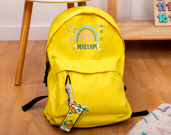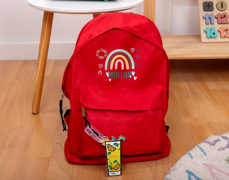 Nuevo curso, ¡nuevos complementos escolares! ¿No es emocionante empezar un nuevo año de estudios buscando las mejores prendas de ropa, objetos, utensilios y demás material para el colegio? No te conformes con elegir uno cualquiera. ¿Por qué no combinar utilidad con diseño como en este pack de mochila e identificador personalizados? Todos tus amigos y compañeros sabrán quién es la persona de todo el centro que más a la moda va. Ya que la vas a utilizar todos los días, personaliza totalmente a tu gusto esta mochila de colores con nombre. ¡Con un precioso arcoíris para alegrarte cada mañana! La impresión sobre la tela de la mochila será a todo color y bien unida al tejido. Y para asegurarnos que no se pierda, te puedes llevar también un identificador de refresco con texto por las dos caras. ¡Deja volar tu creatividad una vez añadas el producto al carrito! Siempre es duro que se acabe el verano, pero nada como un regalo original para la vuelta al cole. ¡Eso sí es empezar el nuevo curso con energía! Medidas de la mochila: 38cm x 40cm. Medidas del identificador: 10x6,5 cm.