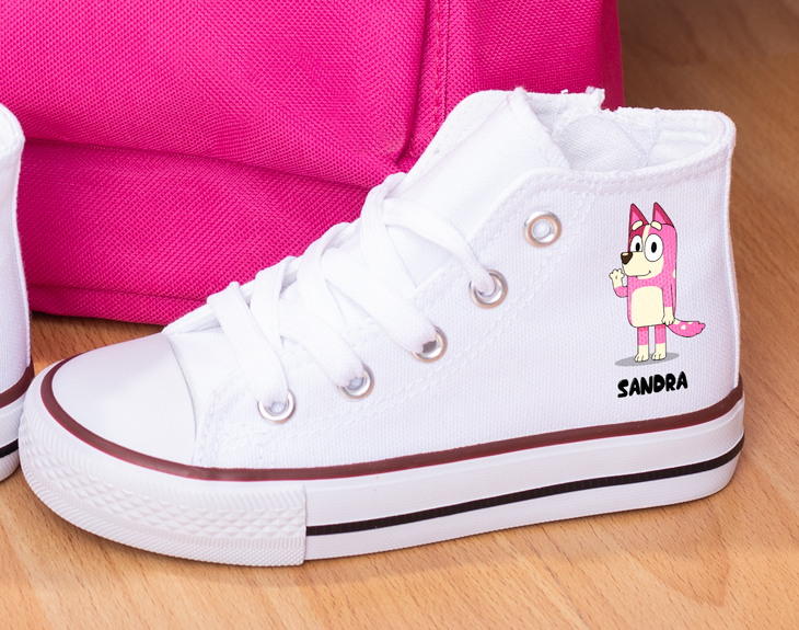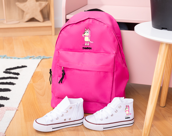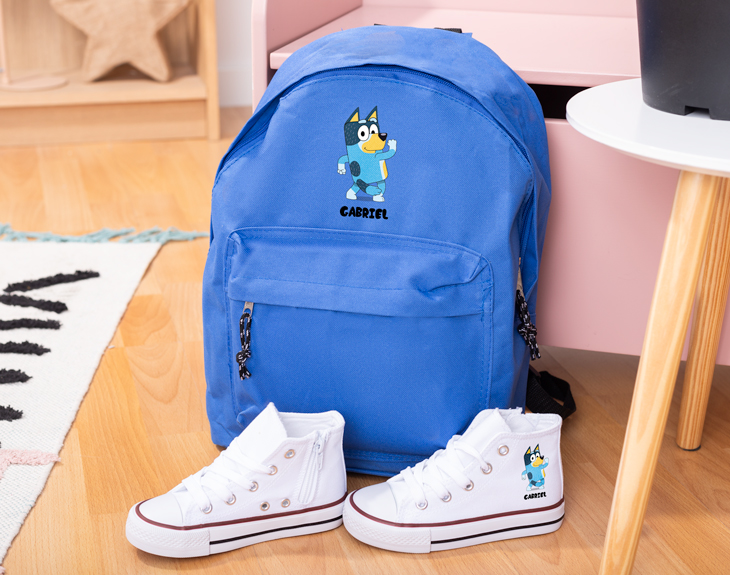 Seguro que el peque de la casa es súper fans de la familia Bluey, los mejores dibujos animados del momento. Por eso, para que disfrute del verano al máximo, necesita este pack de mochila y zapatillas personalizado. Podrá añadir su personaje favorito tanto a la mochila como a las zapatillas y ser la envidia de todos sus amigos vaya donde vaya durante estos meses. ¡Será el kit perfecto para irse de campamento! Si quieres sorprender a tu hijo/a con un detalle súper guay, este original set les encantará. Podrán personalizar ambos productos con su personaje Bluey favorito y lucirlo en cualquier parte. Además, también podrá elegir elegir le color de la mochila y la talla para las zapatillas, que son perfectas para todo tipo de situaciones. ¡Y lo mejor es que nadie tendrá nada igual! No te preocupes porque personalizar este pack es muy sencillo. Añade el producto al carrito y entra en el área de personalización. Una vez dentro, lo único que tienes que hacer es elegir qué Bluey quieres que aparezca en el diseño y completarlo con el nombre de tu peque. ¡Será el mejor regalo del mundo! Medidas de la mochila: 38 cm x 40 cm.