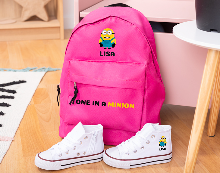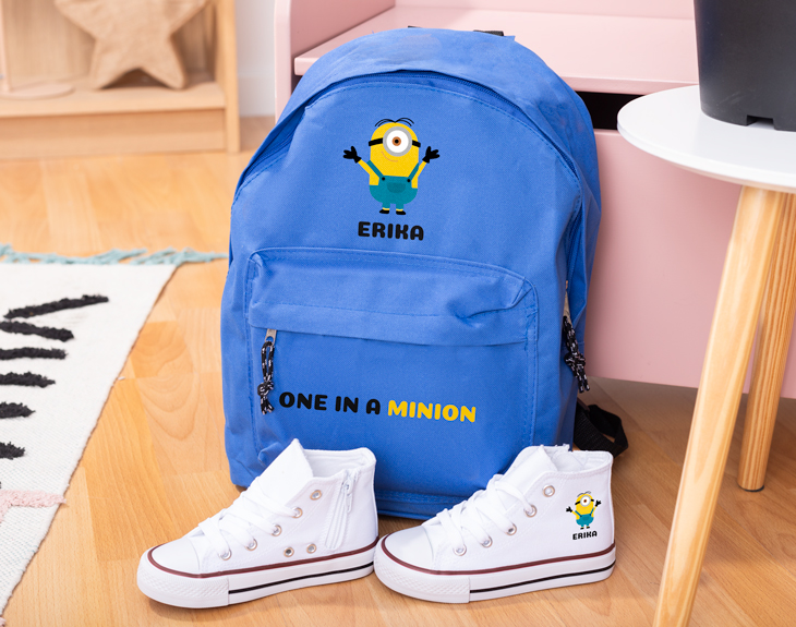 ¿Hay algún niño/a que no sea fan de los Minions? ¡Son geniales, son esos personajes amarillos y pequeños que son súper divertidos! Si tu hijo los adora, tenemos algo que no le puede faltar. Se trata de nuestro pack de mochila y zapatillas con diseño "One in a Minion". ¡Es ideal! ¡Este pack es ideal para el verano! Viene incluido con una mochila del color que quieras y unas zapatillas blancas. ¡Todo ello personalizado! Podrás escribir el nombre del peque de la casa y escoger el minion que más le guste. ¡Será la envidia de todo el verano! Personalizar esta mochila con zapatillas es muy sencillo. El primer paso a seguir consiste en añadir el producto al carrito y entrar al área de personalización. Una vez ahí, ya puedes escoger el minion que quieras y poner el nombre de tu hijo. Pronto estará perfecto y listo para regalar. ¡Será un regalo original para cumpleaños! Medidas de la mochila: 38 cm x 40 cm.
