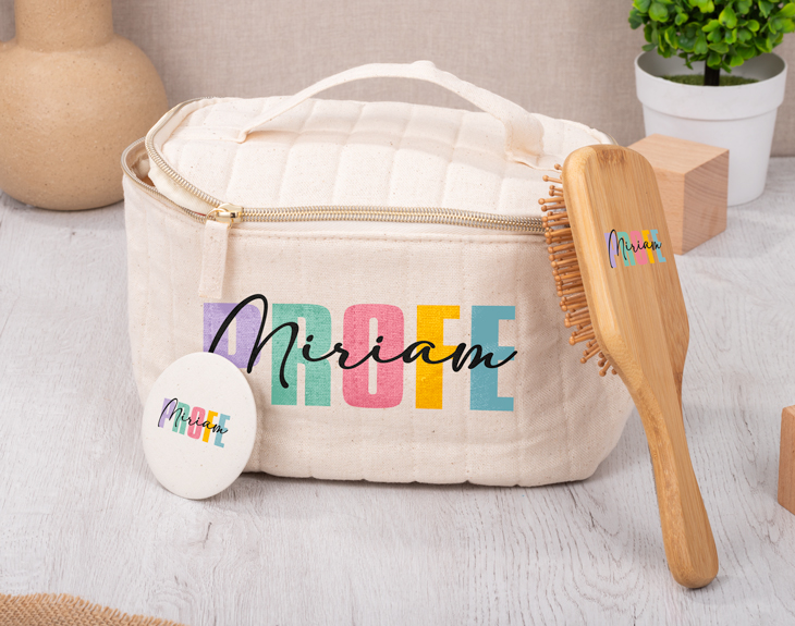 • Neceser Beige personalizado. • Espejo personalizado. • Cepillo de bambú personalizado. • Tarjeta Recordatoria.
