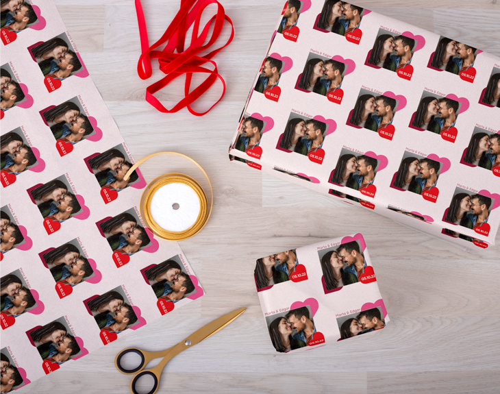 Es vuestro primer aniversario juntos y toca celebrarlo como se merece. Es la excusa perfecta para consentir a tu pareja y tener un detalle súper especial y qué mejor que envolverlo con tu propio papel de regalo personalizado. Es perfecto para dejar a tu pareja sin palabras, porque seguro que no se espera ver un papel con vuestra foto. ¡Es lo más! El regalo que has pensado para vuestro aniversario merece ser envuelto con algo que esté a la altura, como este original papel de regalo que le dará un toque único y además muy romántico. Podrás añadir vuestra foto favorita en los espacios vacíos y también un breve texto para acompañarlo. Será súper fácil y triunfarás en esta fecha tan importante para vosotros. Toca personalizar este papel de regalo para que sea el más especial del mundo. Añade el producto al carrito, entra en el área de personalización, sube al sistema tu foto favorita y listo. Verás como aparece por todo el papel y eso significará que ya está listo. Nosotros nos encargamos de hacer el boceto realidad y enviártelo para que puedas disfrutarlo. El papel es de alta calidad con el grosor ideal para que puedas envolver fácilmente tus regalos. No se trasparenta para que no se vea la sorpresa. Tamaño: 160 x 70 cm. Grosor: 80 gr. Calidad impresión: fotográfica. Importante: el papel se entrega como un producto más, no se envuelven otros productos con él.