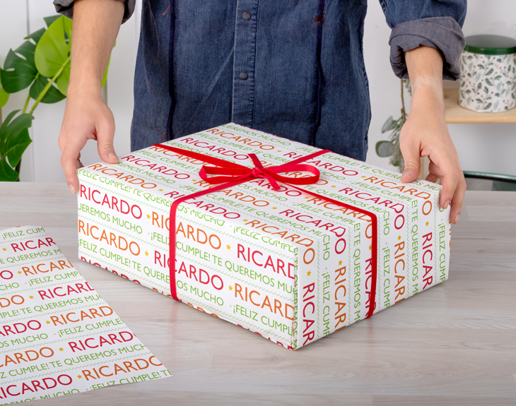 Nuestro rollo de papel de regalo personalizado es perfecto como complemento de un regalo muy original que hayas pensado para tu mejor amigo, un familiar o tu pareja. Solo tienes que decirnos un nombre y una frase para que podamos personalizar el papel y puedas empaquetar los regalos. Es un complemento muy original para las mejores sorpresas. El papel es de alta calidad con el grosor ideal para que puedas envolver fácilmente tus regalos. Tamaño: 160x70cm Grosor: 80gr Calidad impresión: fotográfica. Importante: el papel se entrega como un producto más, no se envuelven otros productos con él.