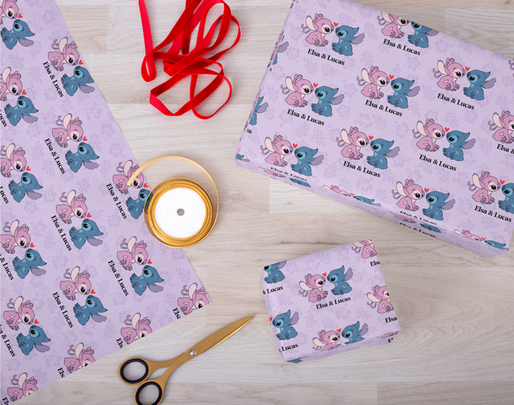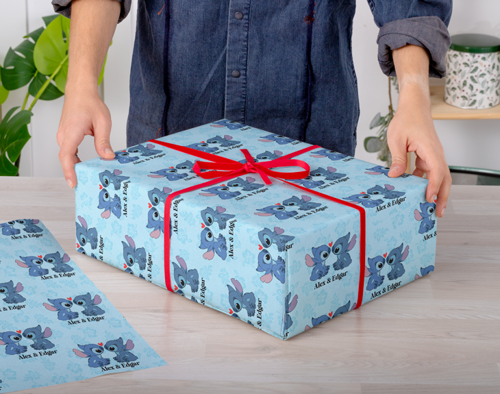 Si hay algo en lo que todos estamos de acuerdo es en que Stitch es la criatura más mona y adorable del mundo. Este divertido dibujo animado ha conseguido conquistarnos a todos, tanto adultos como a los más peques de la casa. Por eso, si tú también conoces a alguien que sea mega fan de este personaje, es el momento de envolver los regalos con tu propio papel de regalo personalizado. Olvídate de los envoltorio aburridos y sorprende a tu pareja, a tu madre o a tu mejor amiga con este precioso detalle que le dejará sin palabras. Está claro que un regalo es importante, pero lo primero que vemos cuando nos lo entregan es el envoltorio. Así que si quieres ser diferente al resto, envuelve todos tus regalos con el papel más original que existe. Nadie tendrá uno igual porque lo especial de este papel es que lo has personalizado tú mismo, desde cero y eligiendo todos los detalles para que sea único. Además, podrás elegir cómo quieres que sea tú diseño y también el color que más te guste. ¡Es lo más! Para personalizar este papel de regalo añádelo al carrito y entra en el área de personalización. Elige el diseño que más te guste y añade el texto o nombres que tú quieras. También puedes colocarlo a tu gusto para que quede genial y listo. Nosotros nos encargamos de que te llegue perfecto y preparado para usar. ¡Tus regalos quedarán genial! El papel es de alta calidad con el grosor ideal para que puedas envolver fácilmente tus regalos. No se trasparenta para que no se vea la sorpresa. Tamaño: 160 x 70 cm. Grosor: 80 gr. Calidad impresión: fotográfica. Importante: el papel se entrega como un producto más, no se envuelven otros productos con él.
