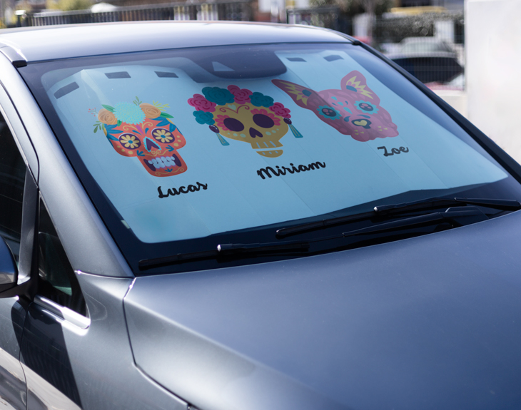 Si eres amante de la cultura mexicana, y estás buscando un parasol frontal para irte de viaje este verano, aquí tienes la solución perfecta: personaliza este parasol con las calaveras mexicanas que quieras. Además, les puedes poner nombres. ¡No hay nada más divertido! Si hablamos del parasol de cartón contamos con un tamaño: 140 cm x 80 cm, apto para monovolumen y camionetas. Además, si hablamos del parasol metálico, tenemos otras dos medidas más: el pequeño de 126 cm x 60 cm, ideal para coches y el grande de 180 cm x 90 cm, pensado para camiones y furgones. Importante: Con más de 6 personajes, éstos se imprimirán en dos filas en el parasol. Material: cartón o metálico (a elegir). No incluyen ventosa.