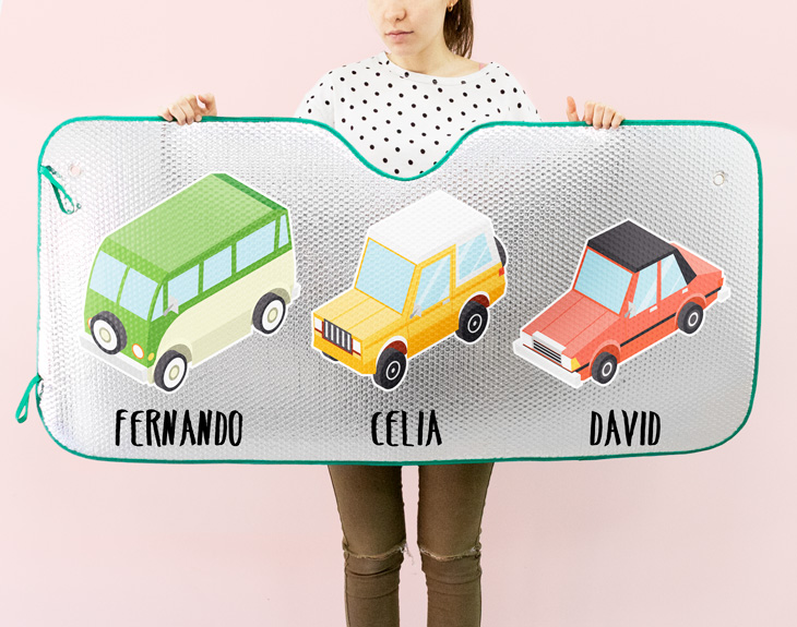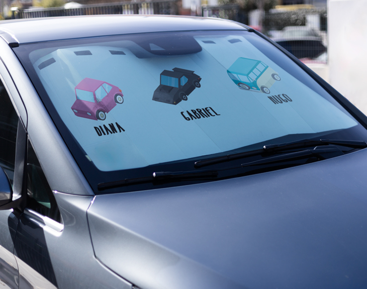 Nuestro parasol frontal personalizado es perfecto para los amantes de los coches. Si tu familia está loca por los vehículos, ahora tienes la oportunidad de crear una familia con diferentes turismos, y ponerles el nombre. Si hablamos del parasol de cartón contamos con un tamaño: 140 cm x 80 cm, apto para monovolumen y camionetas. Además, si hablamos del parasol metálico, tenemos otras dos medidas más: el pequeño de 126 cm x 60 cm, ideal para coches, y el grande de 180 cm x 90 cm, pensado para camiones y furgones. Importante: Con más de 6 personajes, éstos se imprimirán en dos filas en el parasol. Material: cartón o metálico (a elegir). No incluyen ventosa. Importante: a partir de 6 personajes irán distribuidos en dos filas. Es decir: - Familia de 6 personajes: 3 en la fila superior, y 3 en la inferior. - Familia de 7 personajes: 4 en la fila superior, y 3 en la inferior. - Familia de 8 personajes: 4 en la fila superior, y 4 en la inferior.