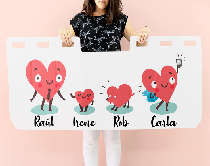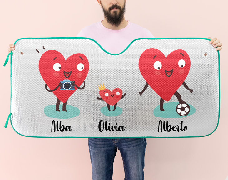 Si tu familia es todo amor, el coche necesita este parasol personalizado. En él podrás elegir entre diferentes corazoncitos y asignarle un nombre a cada miembro del clan. ¡Puro love! Tenemos un montón de corazones esperándote, para que crees tu propia familia. Así, podrás proteger a tu coche de las inclemencias del sol (incluyendo el calor) de una manera divertida y amorosa. Si hablamos del parasol de cartón contamos con un tamaño: 140 cm x 80 cm, apto para monovolumen y camionetas. Además, si hablamos del parasol metálico, tenemos otras dos medidas más: el pequeño de 126 cm x 60 cm, ideal para coches, y el grande de 180 cm x 90 cm, pensado para camiones y furgones. A partir de 6 personajes irán distribuidos en dos filas, es decir, 3 arriba y 3 abajo. Material: cartón o metálico (a elegir). No incluyen ventosa.