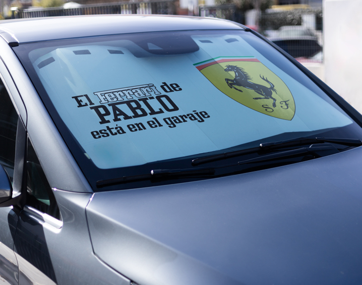 Aquí te presentamos un parasol personalizado para el coche lleno de glamour y estilo. Perfecto para gente que tiene un Ferrari en el garaje, pero que en su día a día sin pretensiones utiliza un coche más normalito. Si hablamos del parasol de cartón contamos con un tamaño: 140 cm x 80 cm, apto para monovolumen y camionetas. Además, si hablamos del parasol metálico, tenemos otras dos medidas más: el pequeño de 126 cm x 60 cm, ideal para coches y el grande de 180 cm x 90 cm, pensado para camiones y furgones. Material: cartón o metálico (a elegir). No incluyen ventosa.