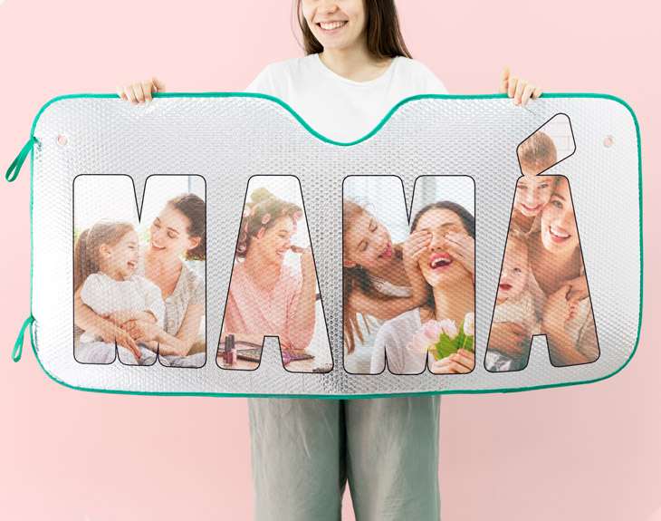 Si la mejor mamá del mundo conduce un fantástico coche, y además, aprovecha los veranos para hacerse unos viajes espectaculares, seguro que este parasol personalizado le hace muchísima ilusión. En verano, todo el mundo aprovecha la sombra para aparcar, pero la mayoría de las veces te quedas sin sitio y tienes que aparcar al sol. ¿Esto te ocurre a ti? ¿También le pasa a tu mamá? Es el momento perfecto para regalarle un parasol frontal. Además este es súper original. Podrás diseñar la palabra mamá con fotos dentro de las letras. Elige cuatro fotos y personaliza una de las palabras más bonitas que existen: mamá. Si hablamos del parasol de cartón contamos con un tamaño: 140 cm x 80 cm, apto para monovolumen y camionetas. Además, si hablamos del parasol metálico, tenemos otras dos medidas más: el pequeño de 126 cm x 60 cm, ideal para coches y el grande de 180 cm x 90 cm, pensado para camiones y furgones. Material: cartón o metálico (a elegir). No incluyen ventosa.