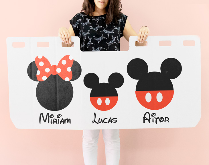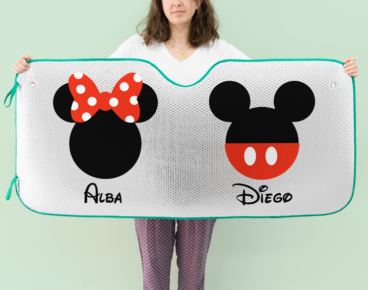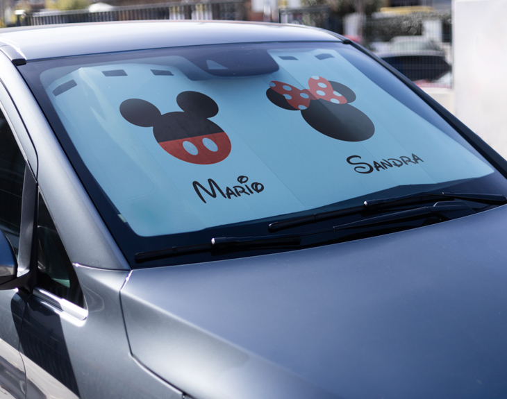 Este parasol para el coche personalizado es el regalo imprescindible para las personas que cuidan a su coche. Además, es perfecto para los fans de la magia, ya que podrás crear a tu propia familia a partir de figuras de Mickey y Minnie. Es muy sencillo: dinos cuantos personajes quieres, pon sus nombres y... ¡Nada más! Con esos pocos pasos, tendrás todo lo necesario para crear un estupendo parasol personalizado. Si hablamos del parasol de cartón contamos con un tamaño: 140 cm x 80 cm, apto para monovolumen y camionetas. Además, si hablamos del parasol metálico, tenemos otras dos medidas más: el pequeño de 126 cm x 60 cm, ideal para coches, y el grande de 180 cm x 90 cm, pensado para camiones y furgones. Material: cartón o metálico (a elegir). No incluyen ventosa.