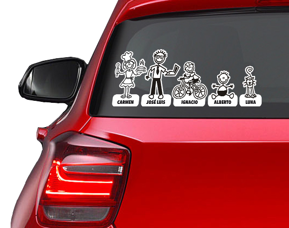 Podrás diseñar tu propia pegatina familiar. Hasta 6 personajes. Altura de la pegatina 16cm. Ancho: Depende de la cantidad de personajes, aproximadamente 30cm. Apta para exteriores, durabilidad 2 años. La pegatina soporta el agua y tiene una protección para los rayos UV. Es una pegatina de exteriores.