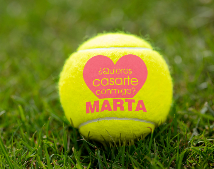 De compañeros de pádel a... ¡Compañeros de vida! ¿Tienes la suerte de estar con el amor de tu vida? Si estáis súper enamorados y ya queréis boda... ¡Tenemos la propuesta más original de todas! Nuestra pelota de tenis o pádel con diseño "¿Quieres casarte conmigo?" es ideal para todas esas parejas que se han conocido practicando algún deporte de raqueta. Lo mejor que tiene es que es personalizable, podrás escribir el mensaje o el nombre que tú quieras. ¡Quedará genial! Sin duda, es genial para usarla en los partidos, en los torneos o incluso en los entrenamientos. Siempre te recordará a esa persona tan especial. Por último, personalizar esta pelota es muy sencillo. El primer paso a seguir consiste en añadir el producto al carrito y entrar al área de personalización. Una vez ahí, ya puedes escribir el nombre que tú quieras. Pronto estará perfecto y listo para regalar. ¡Será un original regalo para deportistas!