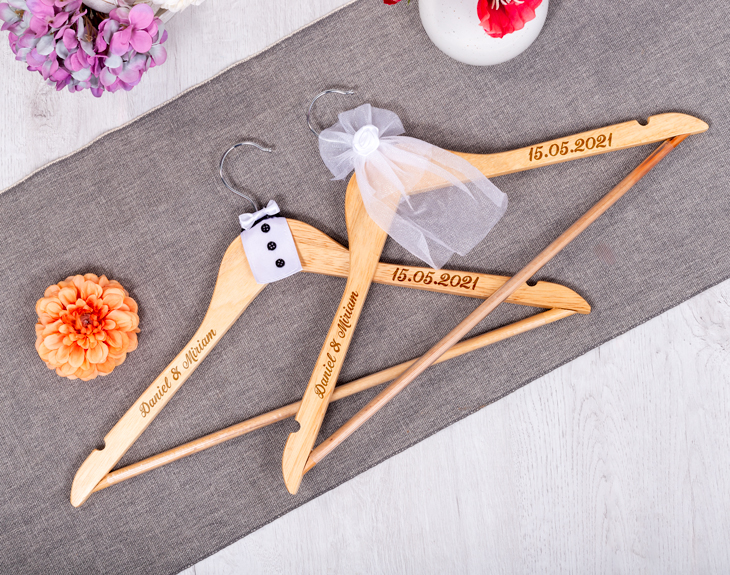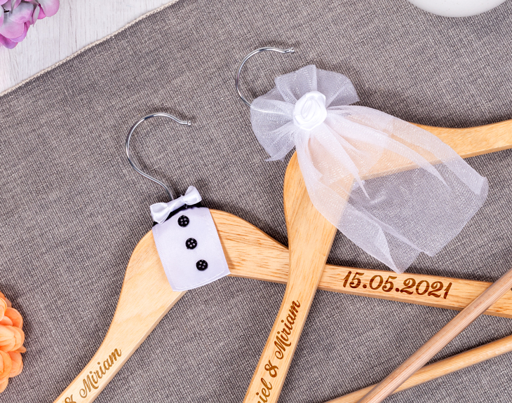 No puede haber una boda sin que los novios tengan sus propias perchas personalizadas. Es un pequeño detalle original que seguro que les encanta y convierte el momento de vestirse en un momento mucho más especial. Las perchas están grabadas con los nombres de los novios y la fecha de la boda. Además, incluye el traje de los novios como elemento decorativo del producto. Antes de pagar, te preguntaremos por los nombres, la fecha y el sexo de los novios para ayudar a que la boda sea muchísimo mejor.