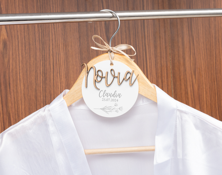 Las cosas que hacen que una boda sea realmente especial y emotiva son los pequeños detalles. Si la novia o el novio es de cuidar al milímetro todo y quiere que en este evento salga todo a la perfección, este es un detalle súper especial para ellos. Se trata de nuestra percha personalizada para novias o novios. Imagínate lo preciosas que quedarán las fotografías de los preparativos de la boda cuando saquen una foto al vestido de ensueño colgado en esta percha tan especial, ¡le quedará un recuerdo precioso! Y es que no es para menos, ya que este día marcará un antes y un después en su vida. Y cuando el evento termine, siempre podrá usar esta percha para mantener el armario bien ordenado. ¡El mejor detalle para bodas! La percha está fabricada con madera y tiene un accesorio de metacrilato. Lo más especial que tiene, es que es personalizable. Podrás escribir el nombre de la novia o el novio y la fecha de ese día tan especial en el accesorio. Para personalizarla, lo primero es añadir el producto al carrito y entrar al área de personalización.