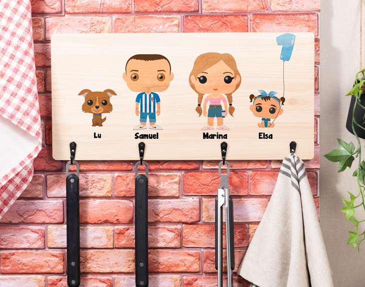 Para sorprender a ese amigo o familiar amante de las barbacoas, hazte con este perchero para sujetar los utensilios. Es un regalo perfecto para hacer por cumpleaños, amigo invisible, alguna ocasión especial o si te quieres dar algún caprichito, ¡siempre te lo puedes autorregalar! Este no es un perchero cualquiera, ¡este perchero es personalizable! Se puede personalizar con un personaje Tinok diseñado por ti. Puedes elegir entre un montón de personajes o bien crear el tuyo propio, eligiendo los rasgos y accesorios que quieras. Imagina la ilusión que le hará tener su familia Tinok estampada en el perchero para barbacoas. Sin duda, es un regalo muy original. Está fabricado con un tablón de madera con cuatro ganchitos, perfectos para sujetar los utensilios necesarios. ¿Cómo se personaliza este perchero Tinok? Lo primero es añadir el producto al carrito y entrar al área de personalización. Lo segundo es crear al personaje Tinok que quieres y una vez diseñado, solo queda terminar la compra y nosotros nos encargamos del resto. ¡Quedará un perchero para barbacoas chulísimo! IMPORTANTE: no están incluidos los utensilios de cocina. Medidas: 49,5 x 24 centímetros. Material: madera.