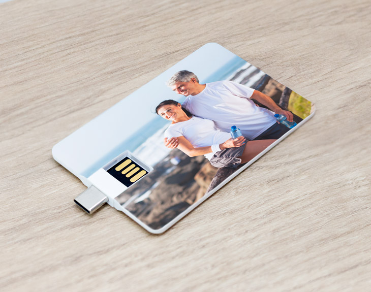 Las memorias USB personalizadas tienen la forma y tamaño de una tarjeta de crédito, por lo que podemos llevarlas cómodamente en nuestra cartera. Además, podemos personalizarlas con la foto que más nos guste, haciendo nuestro USB único.