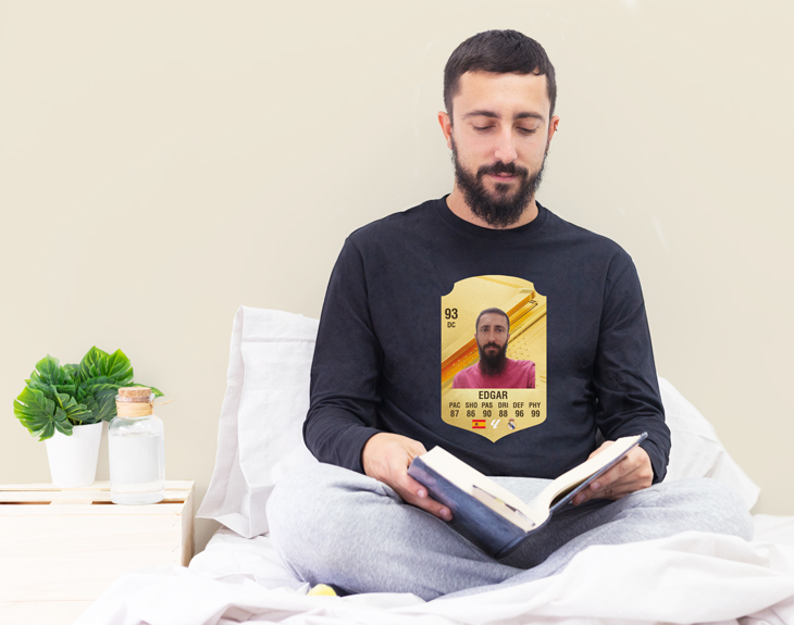 Ahora puedes personalizar tu propia carta FIFA FUT e imprimirla en un pijama personalizado. ¿Estás luchando en la liga de fútbol de la Play Station? Ahora puedes crear tu carta de fútbol para chulear por ahí. Rellena la carta con los datos que tú quieras. Te dejamos inflarlos para que el resultado sea mucho mejor mejor y te vayas a dormir con una sonrisa pensando en todos los logros que has obtenido en el FUT. Puedes escoger entre pijamas de verano, de invierno, de adultos e infantiles. Material: - Camiseta invierno: 100% algodón (excepto color gris: 85% algodón / 15% viscosa). - Camiseta verano: 100% algodón (excepto color gris: 85% algodón / 15% viscosa). - Pantalón invierno: 100% algodón. - Pantalón verano: 100% algodón. Importante: Las medidas son aproximadas, pueden variar 5cm por encima o por debajo. Importante: el tono de los colores puede variar en intensidad según stock. ¿Cómo quitar el fondo de tu imagen? Primero añade la imagen que deseas utilizar, luego selecciónala nuevamente y haz clic en "Editar". A continuación, podrás eliminar el fondo y dejar solo a la persona en la imagen.