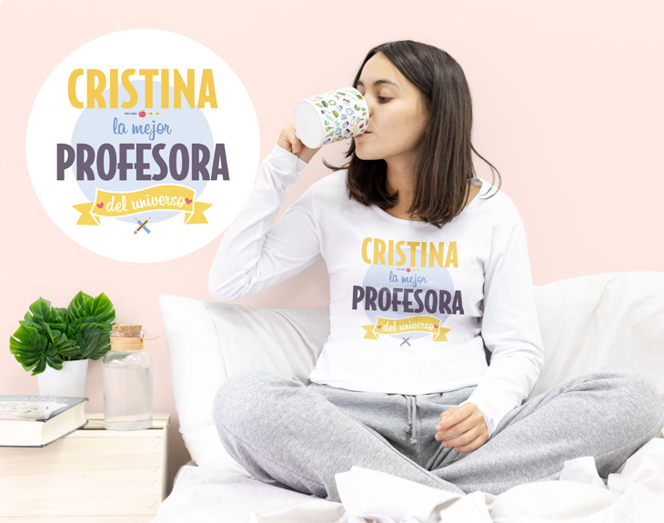 Si este curso habéis tenido la mejor profesora del universo y queréis agradecérselo de una forma original y divertida, este pijama personalizado es el reglo perfecto. Aprovechad el final de las clases para dare una sorpresa tan chula a vuestra profe. Además, es una forma bonita de darle las gracias por todo su esfuerzo y trabajo y sobre todo por su infinita paciencia. Estamos convencidos de que le hará mucha ilusión que sus alumnos le hagan un regalo tan especial como este y seguro que se convertirá en su pijama favorito. Para personalizar el pijama, podréis escoger entre pijamas de verano, de invierno, de adultos e infantiles, además de escoger el color que creáis que más le va a gustar a vuestro profe. Solo tendréis que seleccionar el tipo, color y talla del pijama y decirnos cual es el nombre de vuestro o vuestra profe. ¿No os parece una idea genial? Material: - Camiseta invierno: 100% algodón (excepto color gris: 85% algodón / 15% viscosa). - Camiseta verano: 100% algodón (excepto color gris: 85% algodón / 15% viscosa). - Pantalón invierno: 100% algodón. - Pantalón verano: 100% algodón. Importante: Las medidas son aproximadas, pueden variar 5cm por encima o por debajo. Importante: el tono de los colores puede variar en intensidad según stock