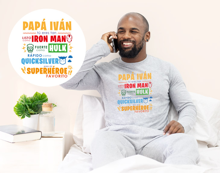 ¿Cuántas noches se habrá quedado tu padre sin dormir por estar cuidándote? Más de una vez habrá tenido que quedarse despierto para dormirte, darte de comer, o estar pendiente de si te pasaba algo. Estamos seguros de que, a lo largo de tu vida, tu padre ha hecho méritos para convertirse en tu superhéroe favorito. Por eso, tenemos este pijama personalizado, con el que dormirá increíblemente bien después de todo un día de actos heroicos. Y es que los mejores superhéroes son esos que no se ven a simple vista. Son esas personas que siempre te ayudan de manera altruista, y que te adoran incondicionalmente. Tu padre es, seguramente, el mejor superhéroe de todos, y por eso se merece un detallazo como este. ¿Acaso los héroes más icónicos se pueden comparar con él? Nosotros creemos que no, y seguro que tú piensas lo mismo. Este pack cuenta con una camiseta y un pantalón de pijama. ¡Puedes elegir el color favorito de tu padre! Dile que es tu superhéroe favorito con este regalo original. Así, cada vez que se vaya a dormir, recordará lo buen padre que ha sido durante todos estos años. Material: Camiseta invierno: 100% algodón (excepto color gris: 85% algodón / 15% viscosa). Camiseta verano: 100% algodón (excepto color gris: 85% algodón / 15% viscosa). Pantalón invierno: 100% algodón. Pantalón verano: 100% algodón. Importante: Las medidas son aproximadas, pueden variar 5cm por encima o por debajo. Importante: el tono de los colores puede variar en intensidad según stock.