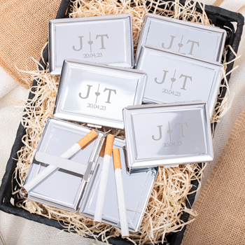 Una boda es un día súper especial, hecha para celebrar el amor por todo lo alto. Si tú va a organizar un bodorrio, rodeado de todos tus seres queridos, tenemos algo que no te puede faltar. Se trata de nuestras pitilleras personalizadas con diseño "Iniciales de amor". ¡Son perfectas para una ocasión como esta! Si quieres sorprender a todos los invitados de la ceremonia con un regalo muy especial, nuestras pitilleras son perfectas para esta ocasión. Es una preciosa forma de demostrarles lo mucho que valoráis su compañía. ¡Será un recuerdo inolvidbale! Además, lo mejor que tiene es que es personalizable, podrás escribir las iniciales de los novios junto con el día de la boda. ¡Quedará genial! Personalizar esta pitillera grabada es súper sencillo. El primer paso a seguir consiste en añadir el producto al carrito y entrar al área de personalización. Una vez ahí, ya puedes escribir el nombre de los novios y la fecha de este día tan especial, nosotros nos encargamos de grabarlo en la pitillera. Pronto estará perfecto y listo para regalar. ¡Será un original regalo para bodas!